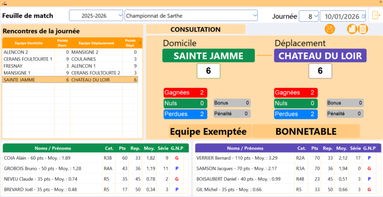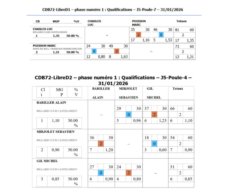 Voici tous les résultat du samedi 10 janvier: Résultats 4 Billes D2 – Ranking 3 (par ordre alphabétique) :NOM Prénom…