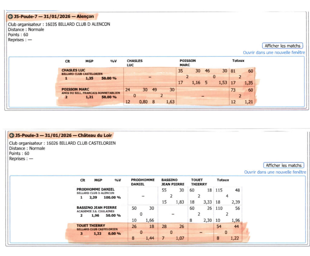 Voici tous les résultat du samedi 10 janvier: Résultats 4 Billes D2 – Ranking 3 (par ordre alphabétique) :NOM Prénom points reprises moyenne série – BOUTARD Jean-Louis @~Jean-louis 1) BOUTARD